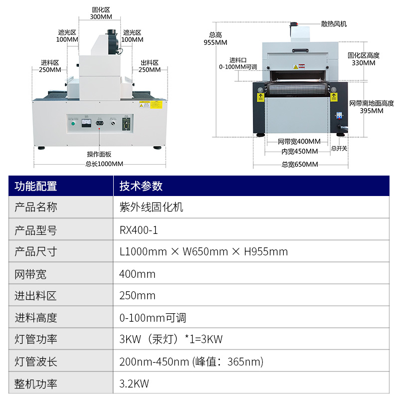 | Equipment usage: | Sample making and small-scale production: ink curing for screen printing, transfer printing, printing, etc; Curing of adhesives such as plastic, metal, and glass; Spray coating and oil curing. |