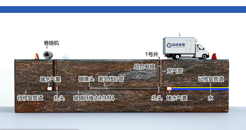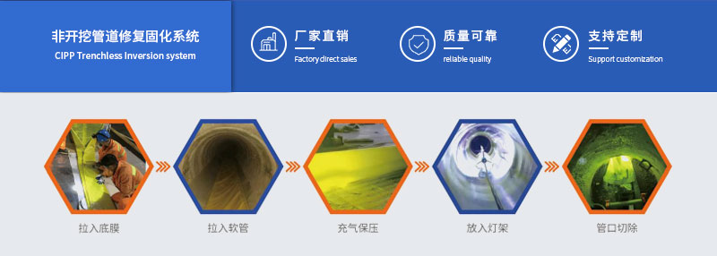 CIPP (in-situ curing) ultraviolet repair technology refers to the use of professional equipment to pull glass fiber hoses that have been ground with resin into the pipeline to be repaired from the wellhead, tie both ends of the hose, and then inject compressed air to support the hose and make it tightly adhere to the inner wall of the pipeline. Through ultraviolet irradiation, the resin is rapidly cured inside the pipeline, forming the inner lining repair technology of "pipe in pipe". After repairing the pipeline, cut off the ends of the tie heads and drain normally without manual cleaning.